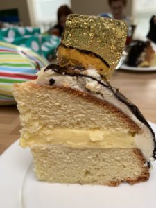 Bak de cake volgens de aanwijzingen op het pak. Wij gebruikten een halve bol-bakvorm om hem in te bakken. We sneden hem in laagjes en smeerden op de “verdieping” banketbakkersroom, maar je kunt ook kiezen voor geklopte slagroom en chocopasta.