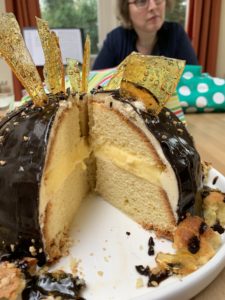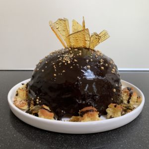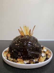Het glazuur kwam uit een pakje van een Duitse winkel: spiegelglazuur met chocoladesmaak! Het ziet er waanzinnig uit maar het bleek bij nader inzien gelatine te bevatten…. toch zit het erop. Op een dun laagje botercrème (roomboter/poedersuiker 1:1) om het goed te laten pakken.