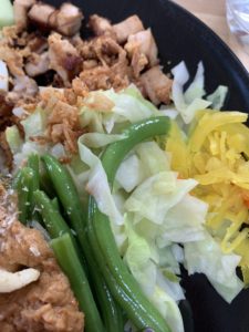 Kook een paar eieren hard; ontpunt, halveer en kook sperzieboontjes; kook (zilvervlies-)rijst; snijd komkommerblokjes; blancheer taugé; bak tofu. Overweeg ook eens geblancheerde spitskool.