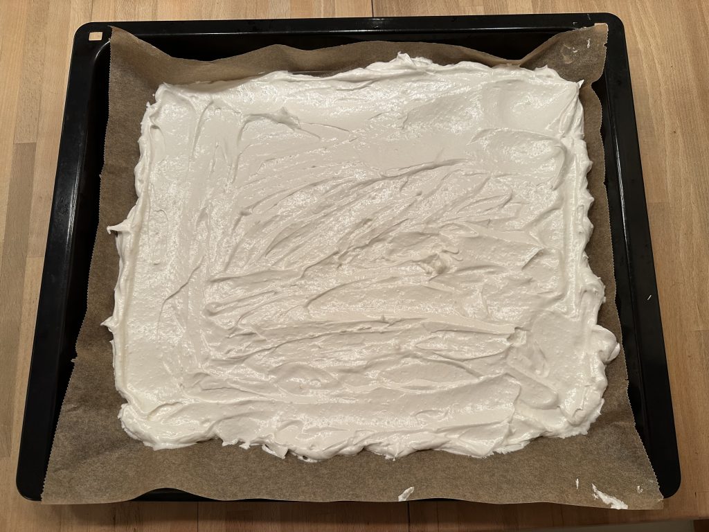 Bak de meringue dertig minuten in de oven tot er een korstje op zit en de meringue gaar is maar nog wel zacht. Laat afkoelen. Kiep de afgekoelde meringue uit de vorm op een nieuw stuk bakpapier, zodat de onderkant boven komt te liggen. Trek voorzichtig, met kleine rukjes, het bakpapier van wat nu de bovenkant is, af.