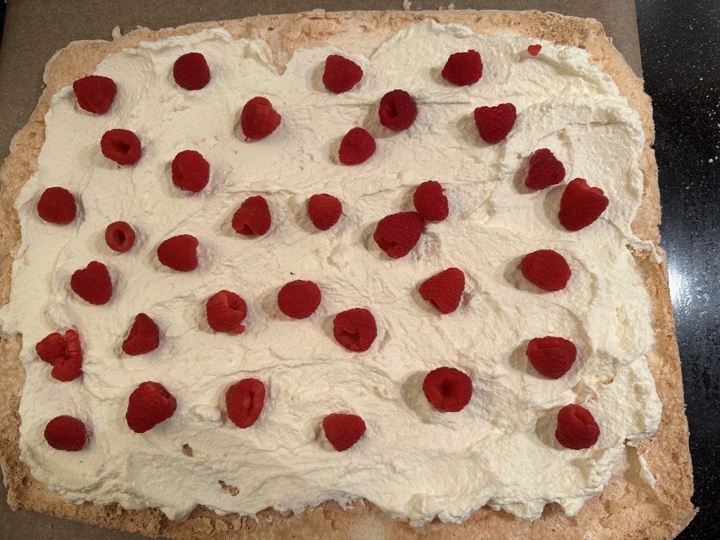 Je kunt er ook voor kiezen om de rol de dag van te voren te maken. Bewaar een rest room en wat frambozen in een bakje in de koelkast. Dek de opgerolde maar nog onopgemaakte merenguerol af met vershoudfolie en zet met schaal en al in de koelkast. Garneer dan met de slingerende streep room vlak voor het opdienen.