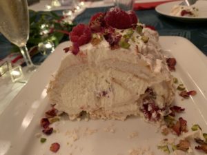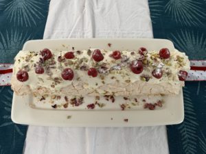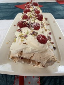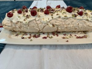 Rol de meringue vanaf de lange kant voorzichtig op, gebruik daarbij het bakpapier om het rollen te vergemakkelijken. Dit is niet gemakkelijk! Bij ons kwamen we een aantal keer niet verder dan een soort opgerolde U, maar bij dit gerecht is de vorm eigenlijk ruim ondergeschikt aan de smaak…..