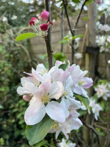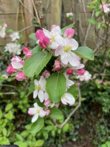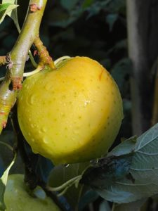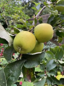 Een heerlijke kleine, gespikkelde appel die opmerkelijk naar ananas ruikt en smaakt. Het boompje geeft ons nu voor het tweede jaar appels (en schitterende wit-roze bloesem). Het eerste jaar oogstten wij nog niets; het tweede jaar oogstten wij trots 16 appels, maar dit jaar zijn het er 72! Dat vraagt om verwerkingsoplossingen.