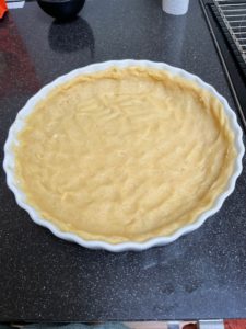 De plak deeg in een ingevette lage ovenvorm van ca. 23 cm doorsnede leggen, platdrukken en uitduwen totdat de vorm met een dunne opstaande rand geheel met deeg bekleed is.