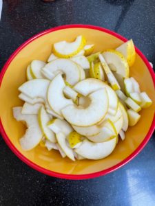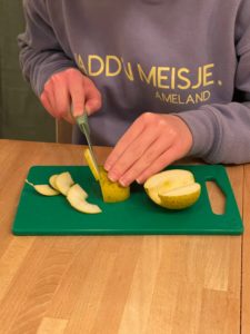 De appels met een appelboor van klokhuis/pitjes ontdoen. Door het boorgat van boven naar beneden halveren en de appelhelften in dunne plakjes snijden. Met wat citroensap besprenkelen en omscheppen om te voorkomen dat de schijfjes bruin worden.