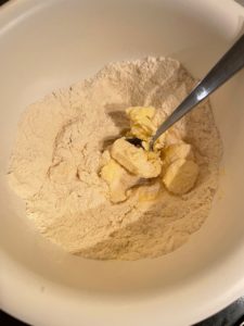 De droge ingrediënten van het deeg mengen. Daarna de boter erdoor kneden. Tenslotte het ei toevoegen en kneden tot een soepel deeg ontstaat.