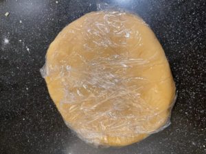 Het deeg platdrukken tot een schijf en in plasticfolie laten rusten.