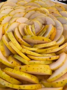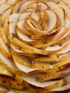 De appelplakjes heel dicht op elkaar van binnen naar buiten rechtop in de spijs zetten als een roosvorm.
