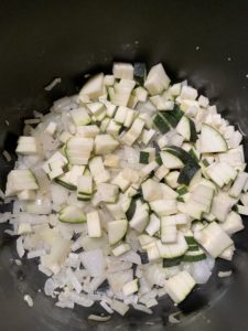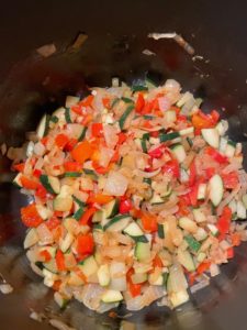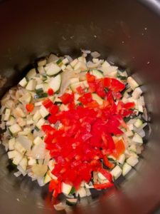 Snij ondertussen de courgette en de paprika in kleine blokjes. Als de ui goed glazig is: bak de courgette en paprika een kwartiertje mee zonder deksel en schep regelmatig om.