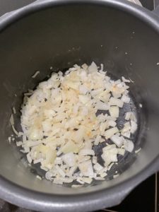 Snipper de ui en bak die, samen met de geperste teentjes knoflook, in een scheutje olijfolie gedurende ongeveer 5 minuten op halfhoge warmtebron.