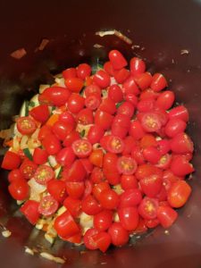 Snij de tomaten met een kartelmes in blokjes* of halveer de kerstomaatjes. Breng de pan met de tomaat erin aan de kook en doe er een deksel op. Als de inhoud kookt: zet de warmtebron lager en laat de groenteprut een half uur pruttelen. Schep regelmatig om.
