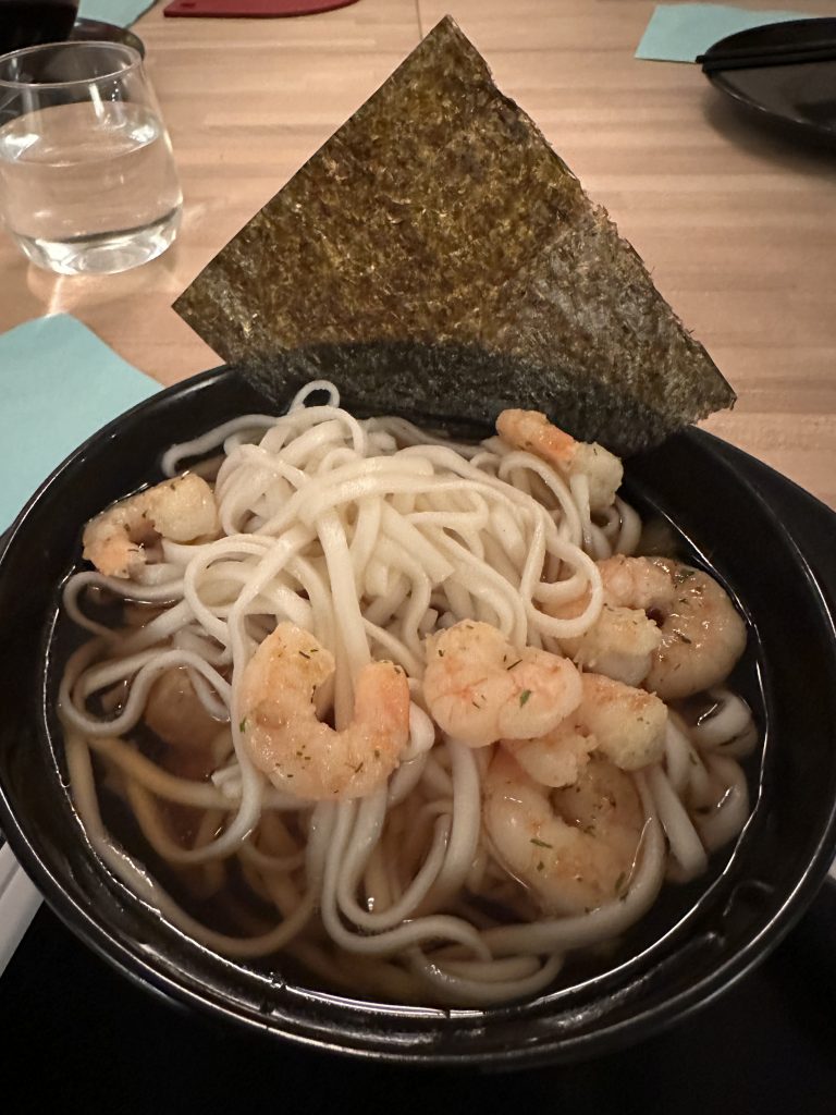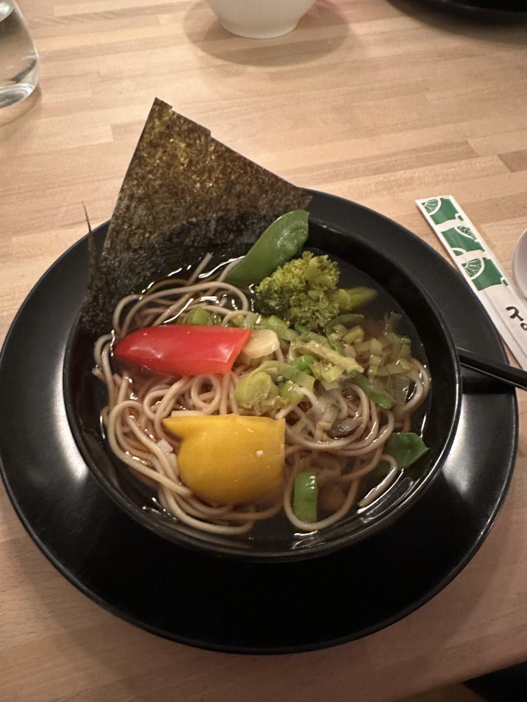 De echte ramen soep is getrokken van hetzij varkensbotten, hetzij kipresten. Als rechtgeaarde vegetariërs hebben wij 1x de kipvariant in een restaurant in Amsterdam gegeten, die werkelijk fantastisch was, maar werken wij thuis alleen maar met een echt vega versie. Sligro heeft een zeer aanvaardbare geconcentreerde vega basisbouillon die wij bij diverse gelegenheden verrijkten met (een combinatie van):