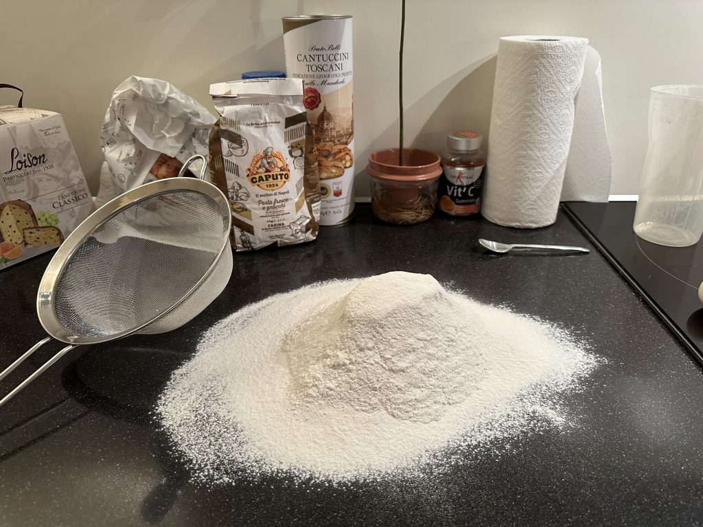 Zeef de bloem met het zout op het schone aanrecht en maak een kuil in het midden. Klop de eieren los met de olijfolie.