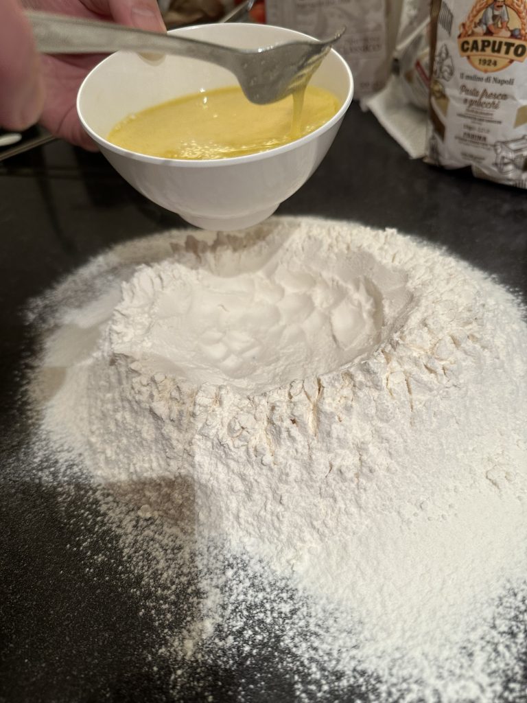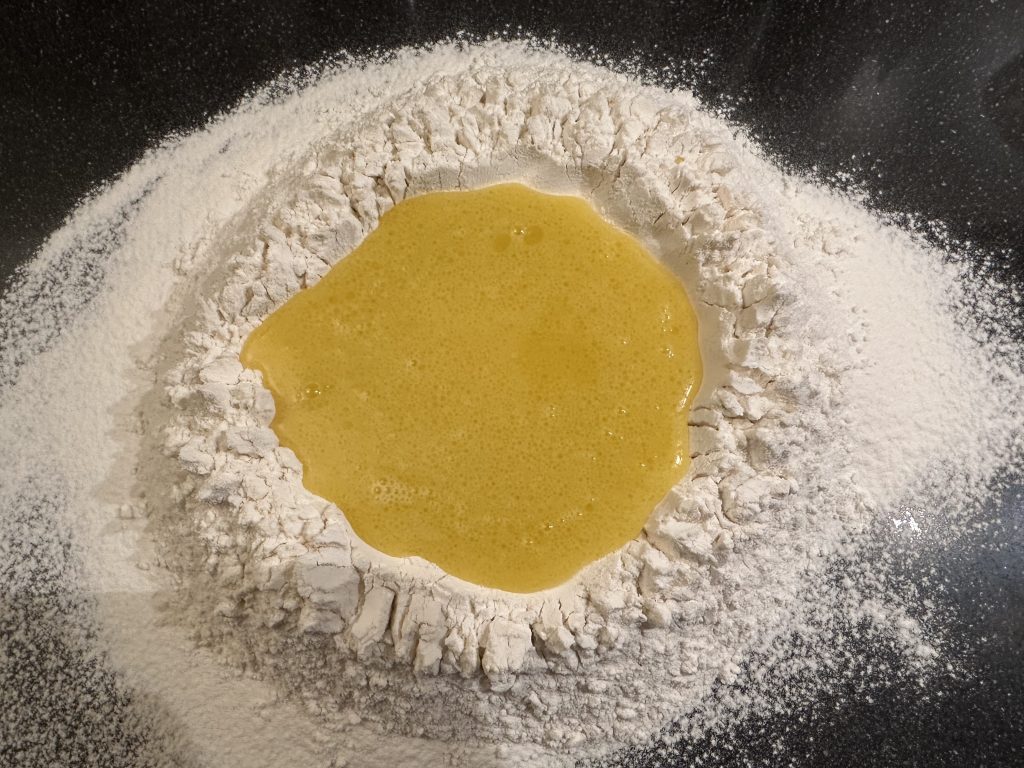 Schenk het eimengsel in de kuil en roer met een vork of met je vingers de bloem door het eimengsel. Let wel op dat de rand van de ‘krater’ heel blijft anders stroomt het ei over het aanrecht. Meng alles tot een homogene massa en kneed het deeg 10 -15 min tot het soepel en elastisch aanvoelt. Duw het deeg met je hand op het aanrecht en draai het telkens een slag. Als het deeg te droog aanvoelt kun je nog wat lauw water toevoegen. Als het te nat aanvoelt voeg je nog wat bloem toe. Na 10 – 15 min veert het deeg terug als je het induwt en voelt het fluweelzacht aan…..