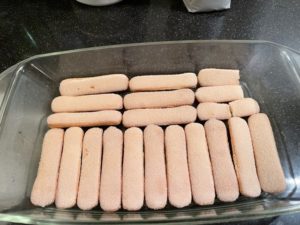 Leg een laag lange vingers in een platte schaal. Giet of schep de helft van de koffie er gelijkmatig overheen.