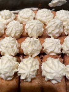 Doe de rest van het slagroom-mascarpone-mengsel in een slagroomspuit en spuit naar eigen inzicht een laag garnering over de lange vingers. Bestrooi ook deze laag met cacaopoeder.
