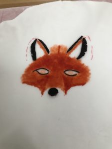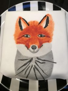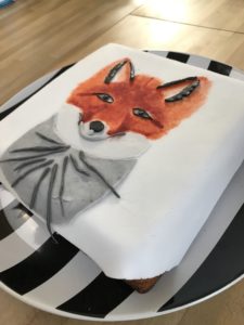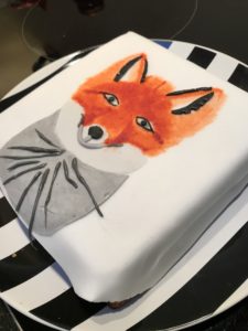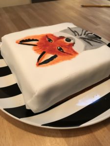 De taart zelf was een vierkant gebakken cake. De cake sneden we horizontaal door. Op de bovenste helft smeerden we jam, op de onderste helft een laag zoete slagroom. Toen we de helften weer op elkaar gelegd hadden bekleedden we de taart met witte fondant. Op de fondant hadden we met paprika-kleurstof, zwarte (verdunde) kleurstof en reepjes opgerolde grijze fondant (zwart met wit gemengd) een vos geschilderd, terwijl we naar een deurmatje in de keuken loerden waar een mooie vos op afgebeeld staat.